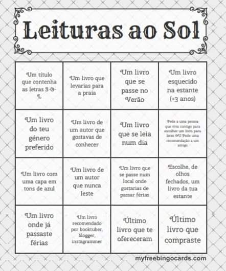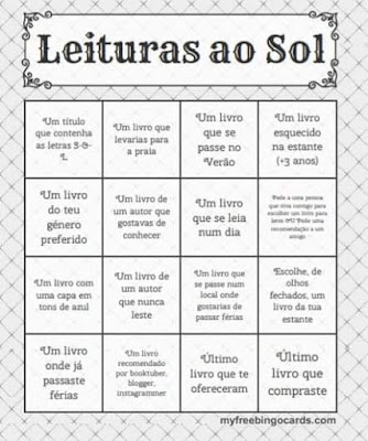 Aqui fica o meu cartão do Book Bingo Leituras ao Sol. Não consegui completar o cartão por duas categorias, mas o balanço é positivo.